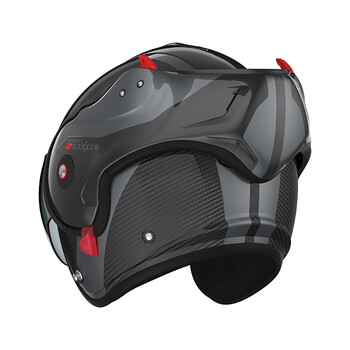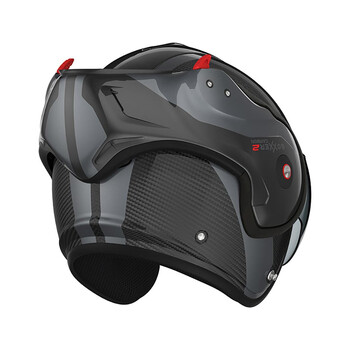 Hij heeft vijf schokabsorberende zones om je te beschermen tegen het risico van vallen of stoten. Het systeem kan worden gemoduleerd in volledige of jetmodus. Wat je ook kiest, de aerodynamische prestaties blijven behouden. Het heeft ook een dubbele P/J goedkeuring en voldoet aan de ECE 22.06 certificeringsnormen.
